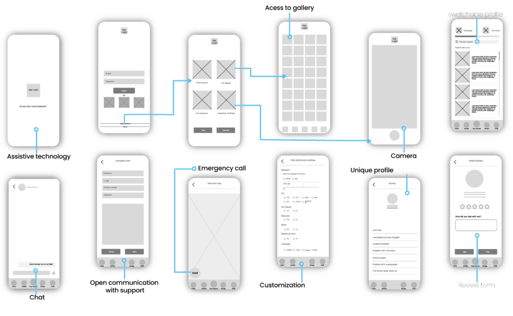 After reviewing the user preferences, sketches, and AI, I finalized the Lo-Fi digital wireframes that contemplated all the screens and their functionality. One of the biggest challenges we faced was realizing that I needed to add more features than originally planned to provide users with a smoother experience within the app.